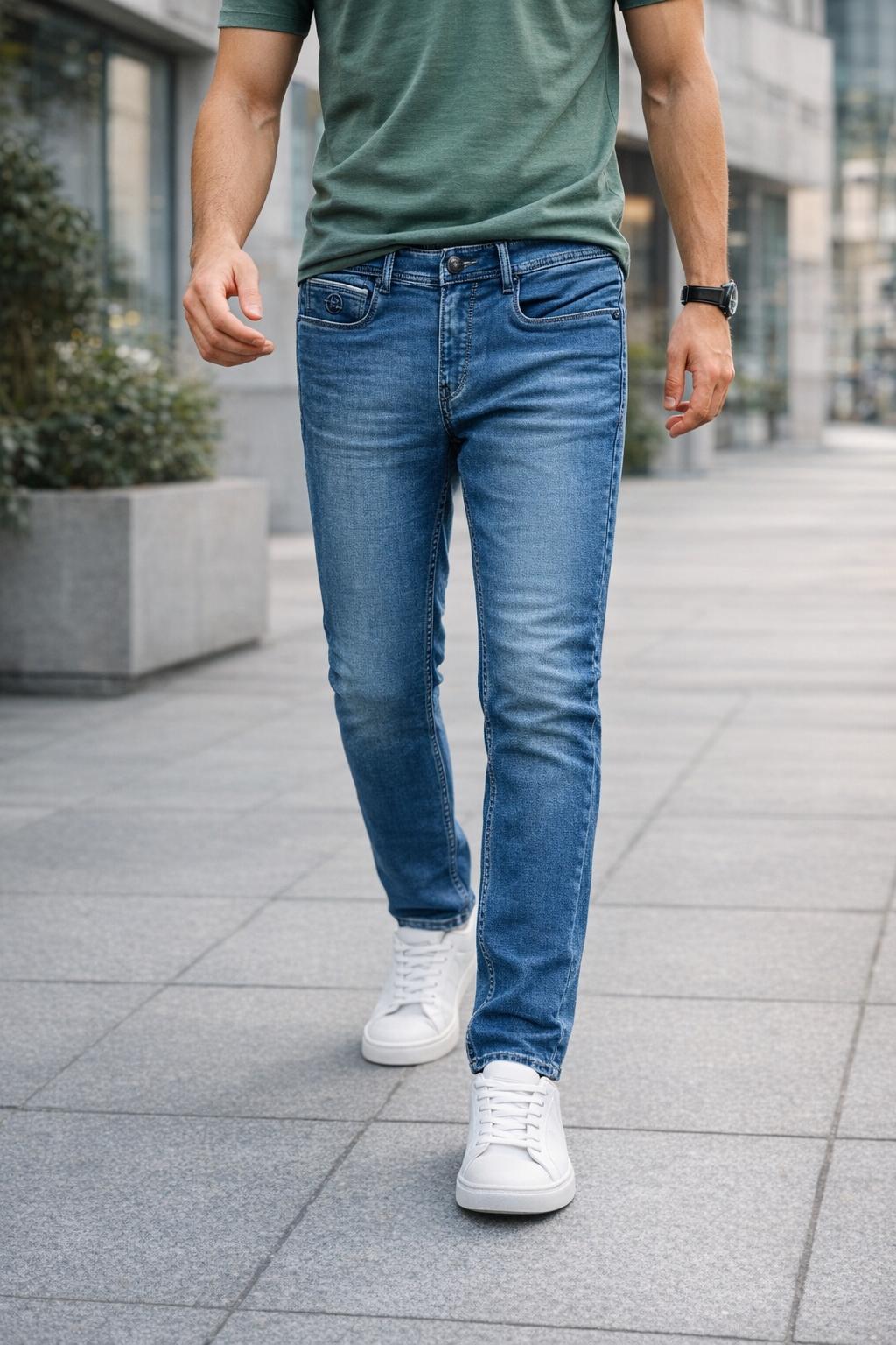 Classic blue slim-fit denim jeans featuring a clean wash and refined silhouette. Designed with comfortable stretch, five-pocket styling, and a versatile look that works effortlessly for everyday casual and smart-casual wear.